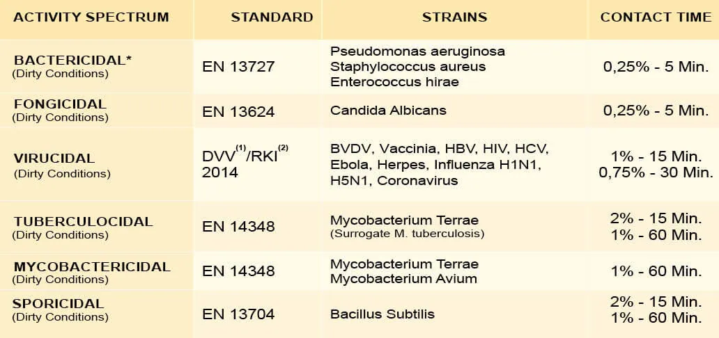 - Virucidal (HIV, HBV, HCV, Herpes, Vaccinia, BVDV, Influenza, Εbola, Coronavirus…)